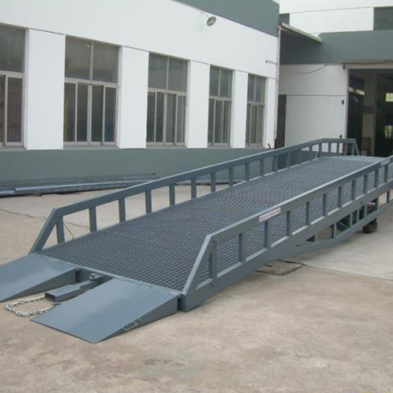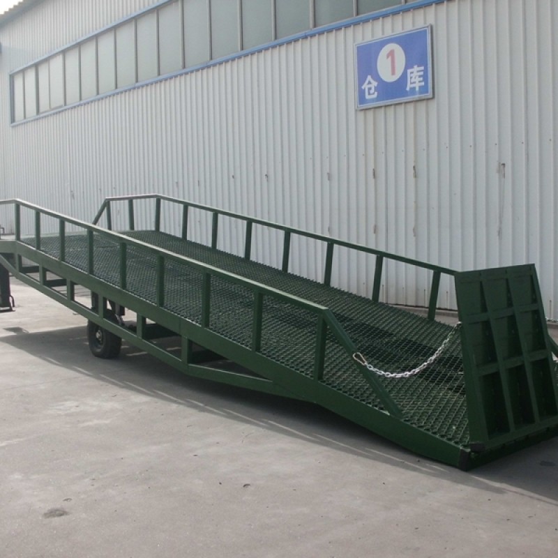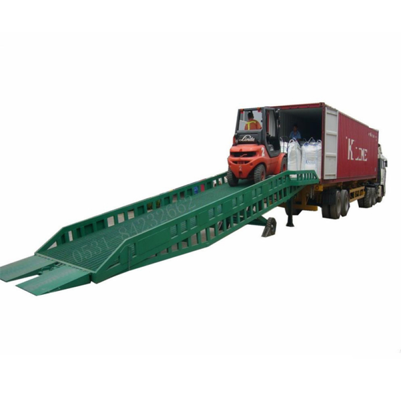 移动式登车桥是与叉车配合使用的货物装卸辅助设备,可根据汽车车厢的高低调节高度,叉车可以直接通过本设备驶入车厢内部进行货物的批量装卸,仅需单人作业,即可实现货物的快速装卸。它使企业减少大量劳力,提高工作效率,获取更大经济效益。 产品特点: 1、台面采用特制的菱形网格板有可靠的强度,能保证长期使用而不变形。它的菱形网状结构,充分保证了卓越的防滑性能,使叉车有更好的爬坡性和可操纵性。即使在雨、雪天气,仍能保证正常使用。 2、调节长度的索链能方便地钩住货车,使移动式登车桥与货车始终紧密贴合。 3、采用手摇液压泵作动力,勿需外接动力电源即可轻松实现登车桥的高度调节。 4、配置的刹车垫可有效防止货车装卸时登车桥移位。